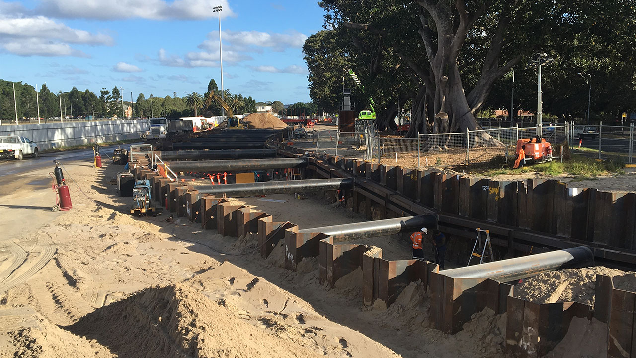 Bringing geotechnical and structural engineering expertise to support a unique sheet pile walling system with props and waler beams to assist in constructing Moore Park Tunnel for Sydney Light Rail.