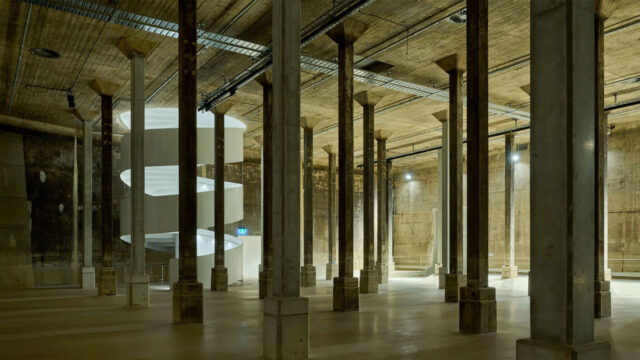 Interior view of the Melbourne Metro Tunnel under construction with workers walking inside the large concrete tunnel next to pipes and ventilation ducts